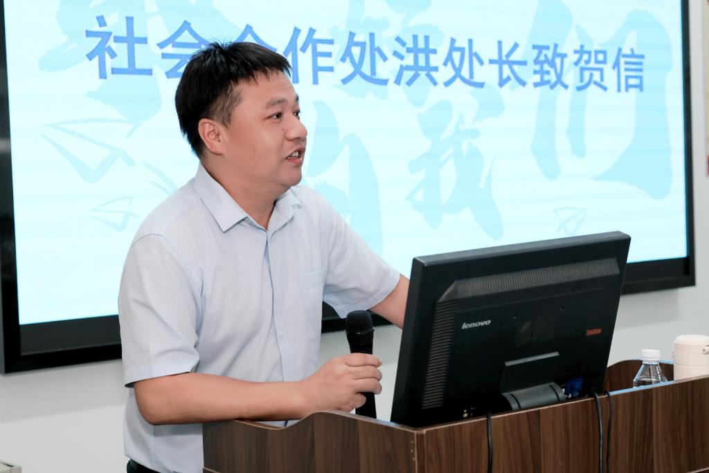 社会合作处洪云飞副处长致贺信。他代表学校欢迎各位校友回家,表达了对校友们的关心与期望,并向在座校友介绍学校近年来的发展概况。他勉励大家珍惜当下,葆有热情迎接未来,期待校友们常回家看看。